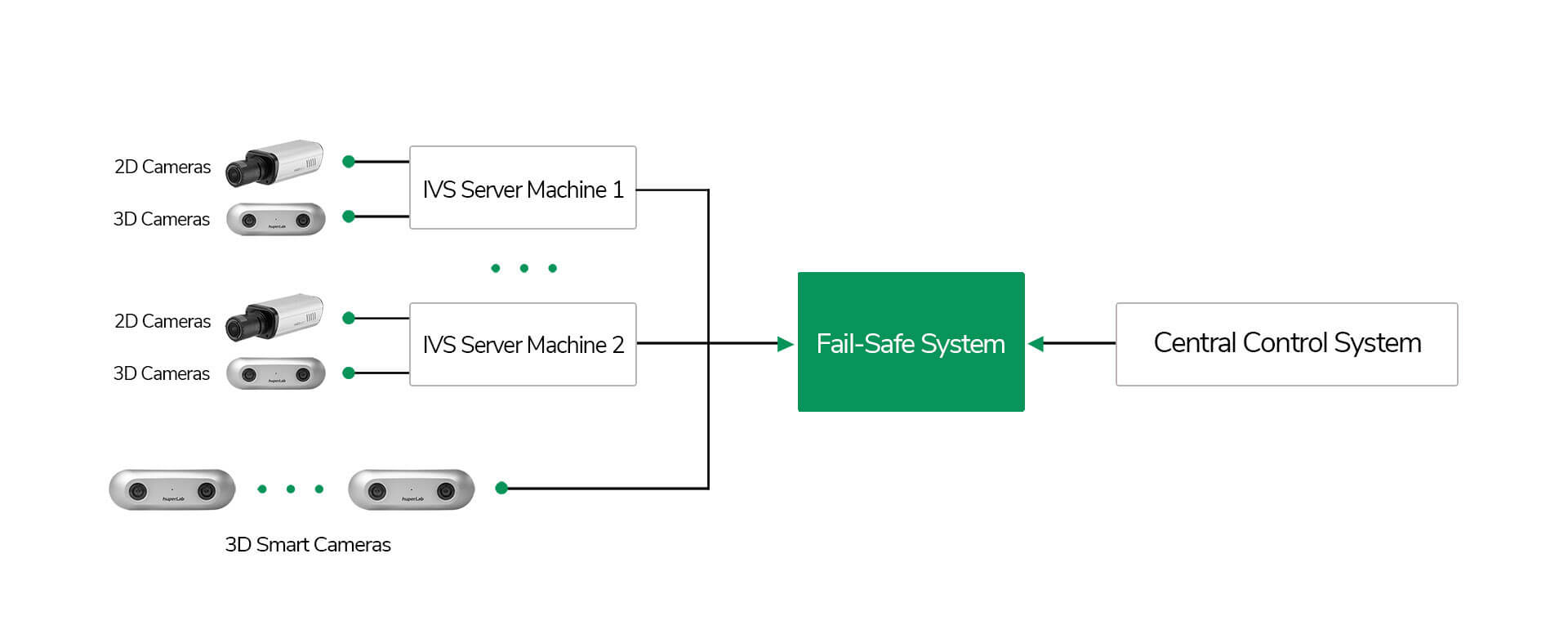 The Fail-safe System monitors IVS Server machines and 3D cameras to ensure they are all functioning well. A TCP port is used as an indicator of the system. The port is open when the system is normal, closed when a critical failure has occurred. Checking the TCP port open state regularly to understand the system, either normal or malfunctioned so as to take appropriate action, for example to reboot the whole system or to stop and fix them.