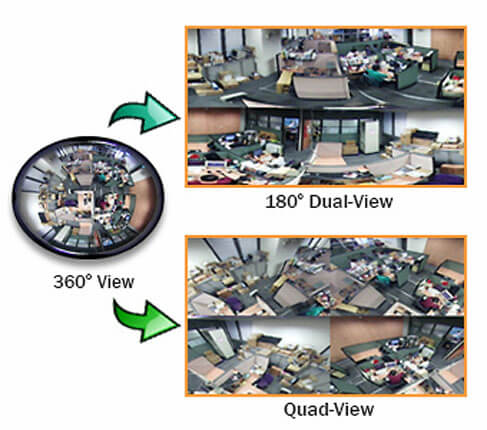 • Fisheye Dewarping can unwrap video images from the original 360° fisheye cameras to display the broad, hemispherical and panoramic view without blind spot.