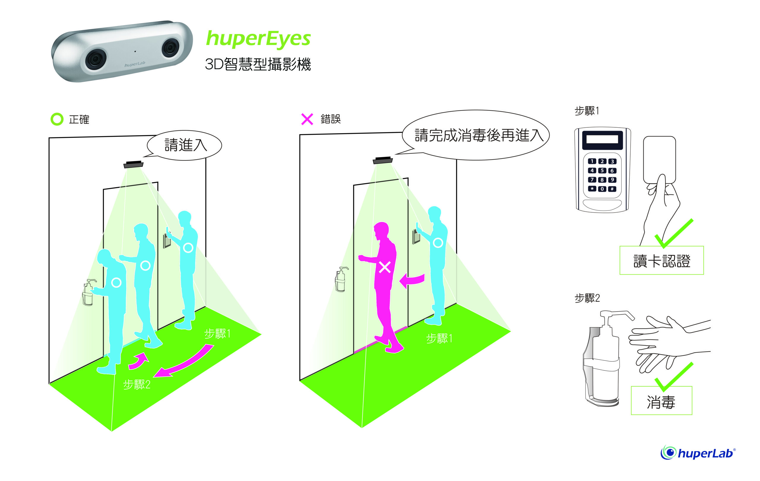 該解決方案應用在入口,檢查人員是否有移動到指定的位置並停留指定的時間以對手部進行消毒。如果有人不遵循此程序,該系統將透過其內置揚聲器播放預先錄製好的聲音來警告該人員在進入該區域之前務必要對手部進行消毒。該解決方案可以和門禁系統整合或獨立使用。